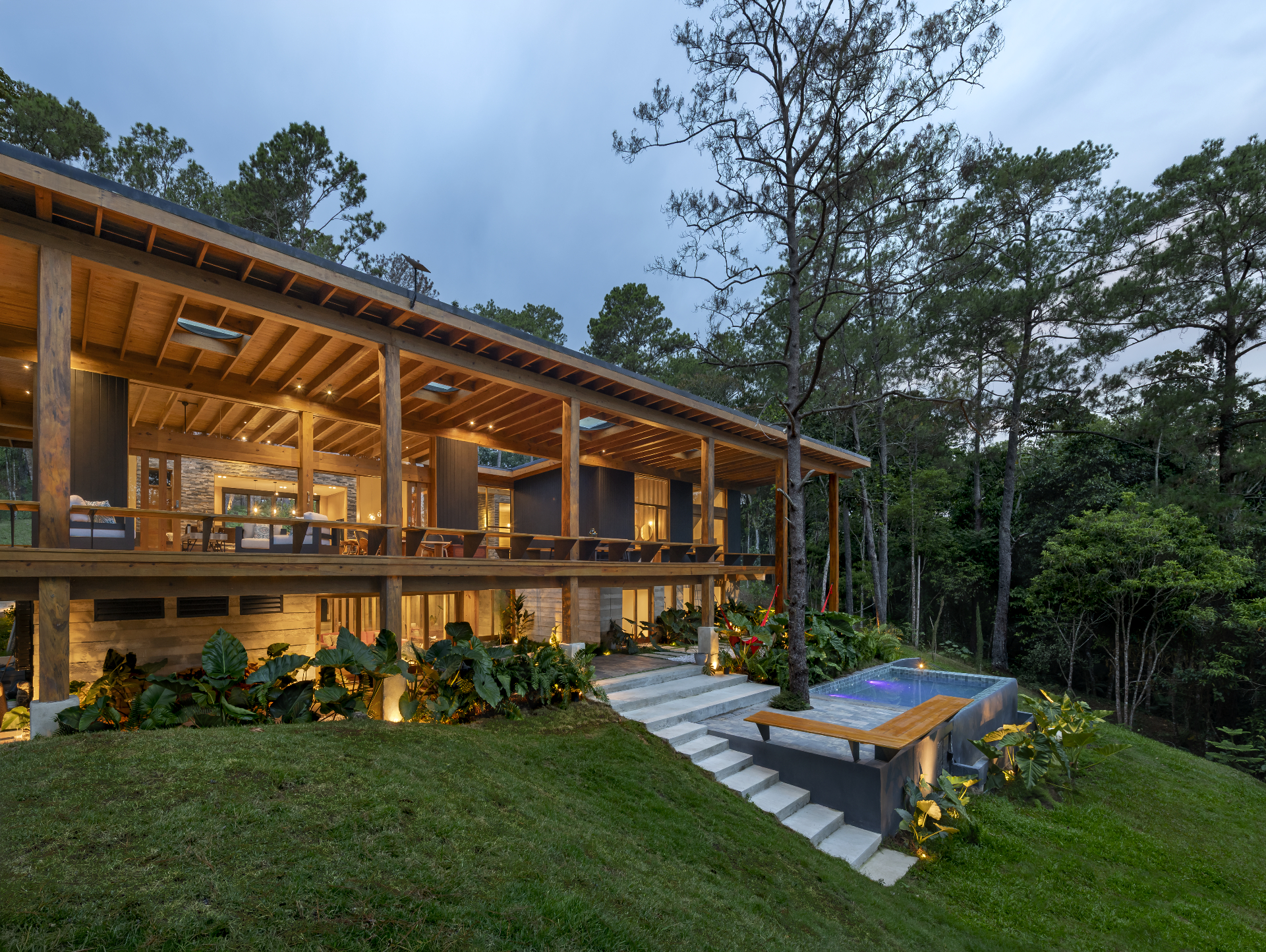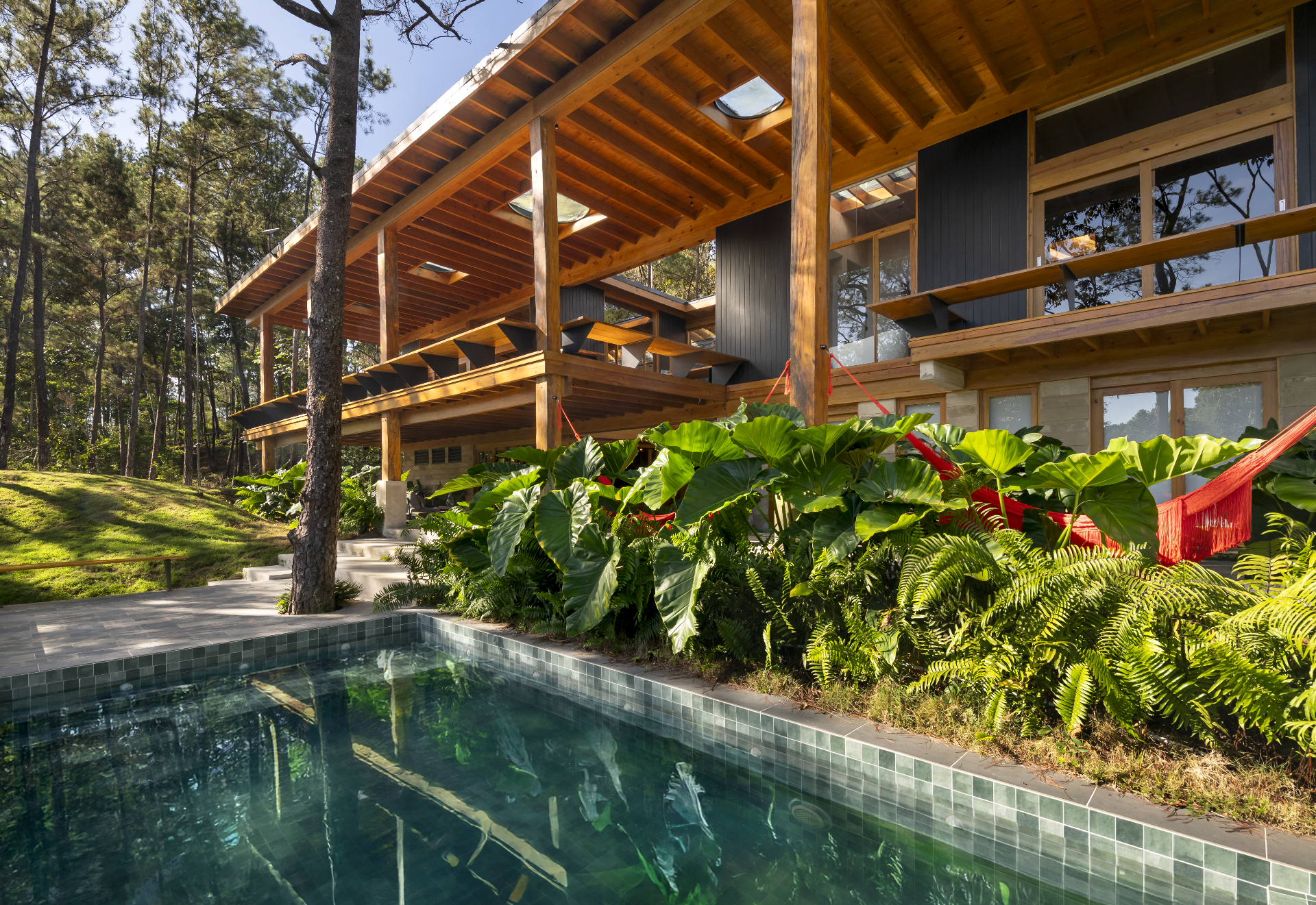 El nivel inferior, la integración con la topografía se hace más fuerte, resultando en una simbiosis armoniosa entre la construcción y el terreno natural. Este nivel, al igual que el superior, se estructura alrededor del atrio central, que sigue siendo el núcleo distribuidor. Desde aquí, se accede a las habitaciones de invitados, cada una diseñada para ofrecer comodidad y vistas al entorno natural, así como a las áreas de servicio, dispuestas con discreción. La secuencia espacial en este nivel se desenlaza en otra serie de espacios sociales, un estudio que se integra a una terraza en contacto directo con el paisaje, acompañada de una piscina, que más que un simple elemento recreativo, ha sido concebida para fundirse con el paisaje circundante.
