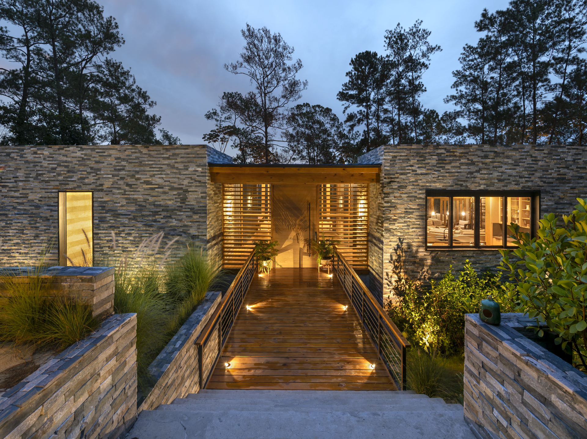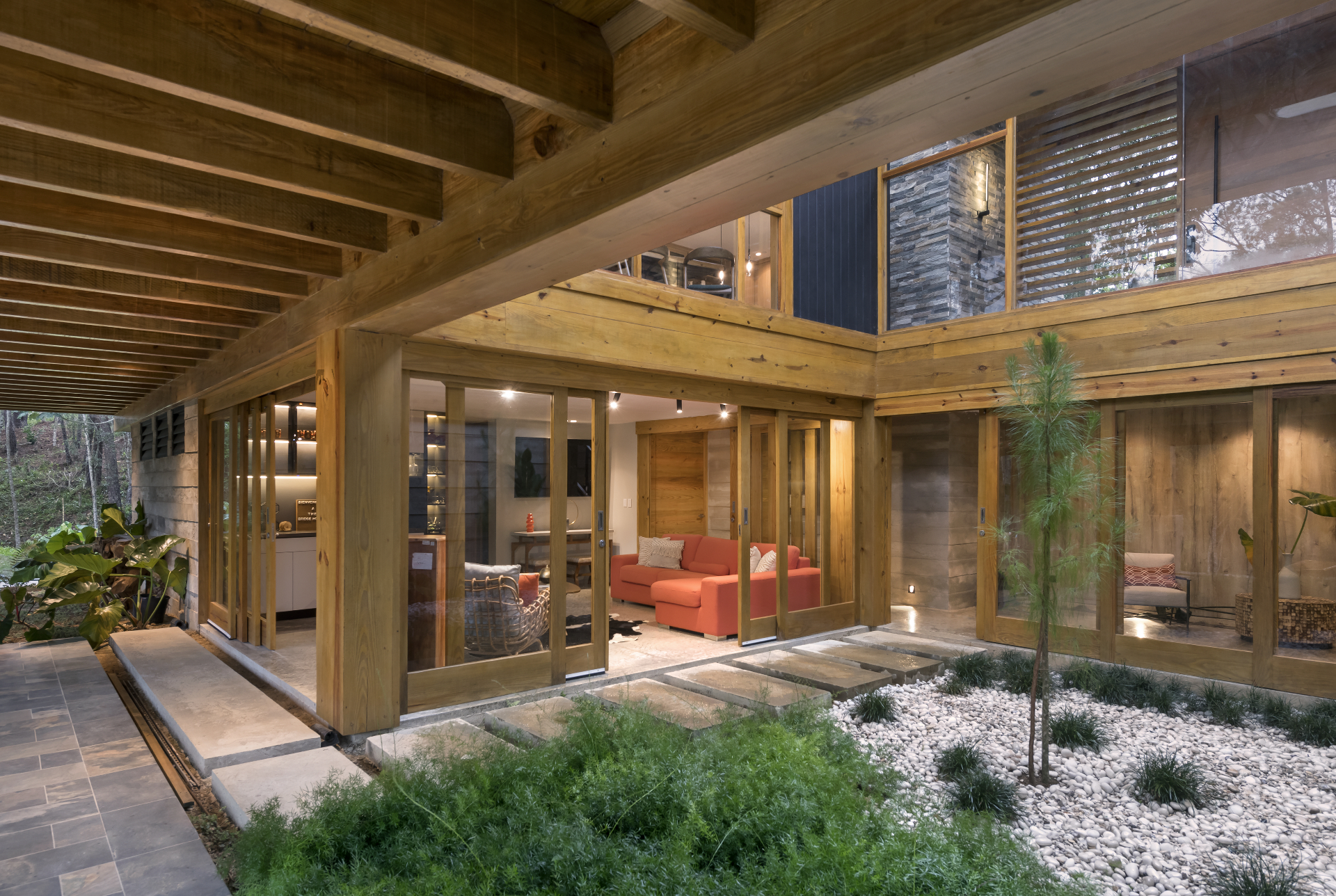Debido a la pronunciada topografía del terreno, el acceso principal se sitúa en el nivel superior. Este nivel se organiza alrededor de un atrio ajardinado. Este atrio funciona como una sutil barrera que divide los espacios sociales de la intimidad de la habitación principal. Esta configuración permite que la casa opere con eficiencia cuando solo los propietarios están presentes, ofreciendo una experiencia de vida cómoda en un solo nivel, optimizando la privacidad y la funcionalidad.